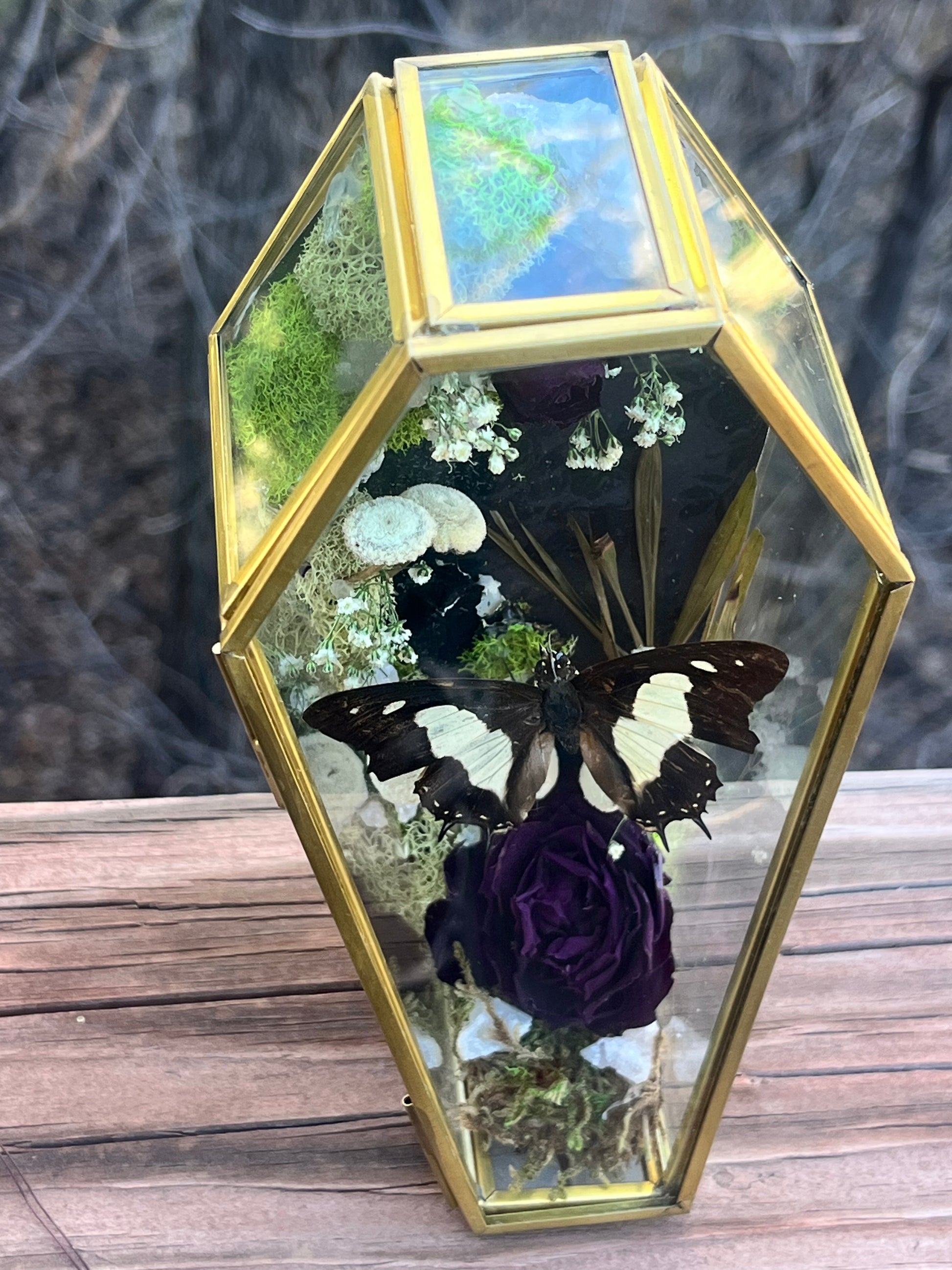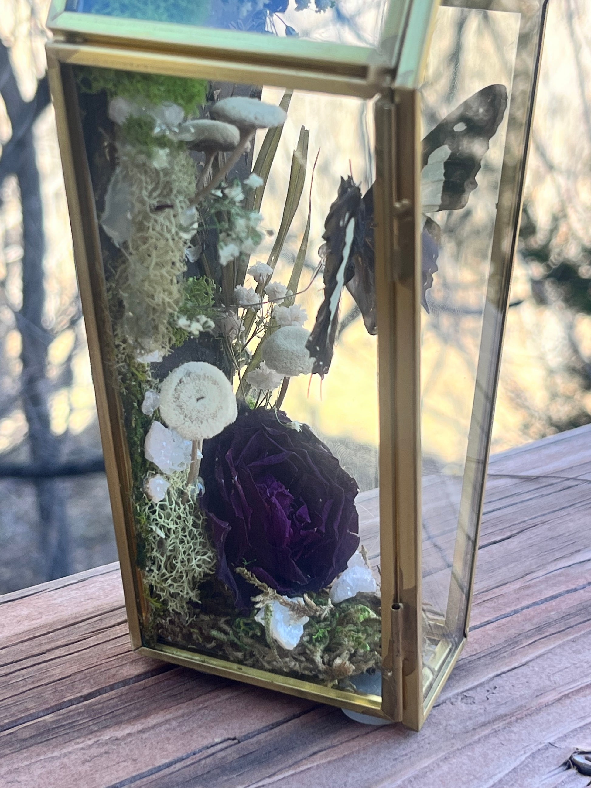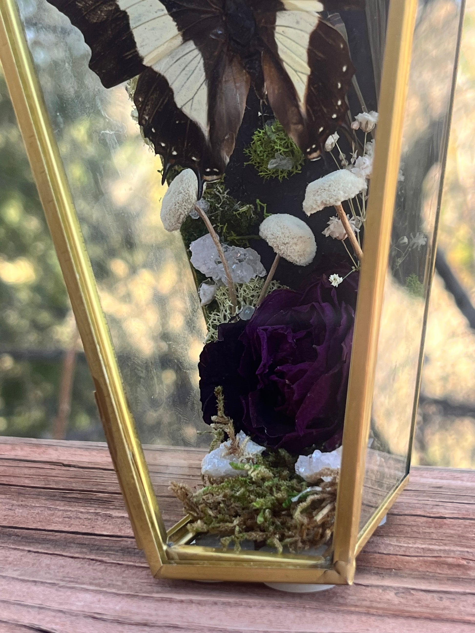 Polyura athamas accompanied by geodes, roses, moss, baby’s breath and mushrooms. (3”x7”)