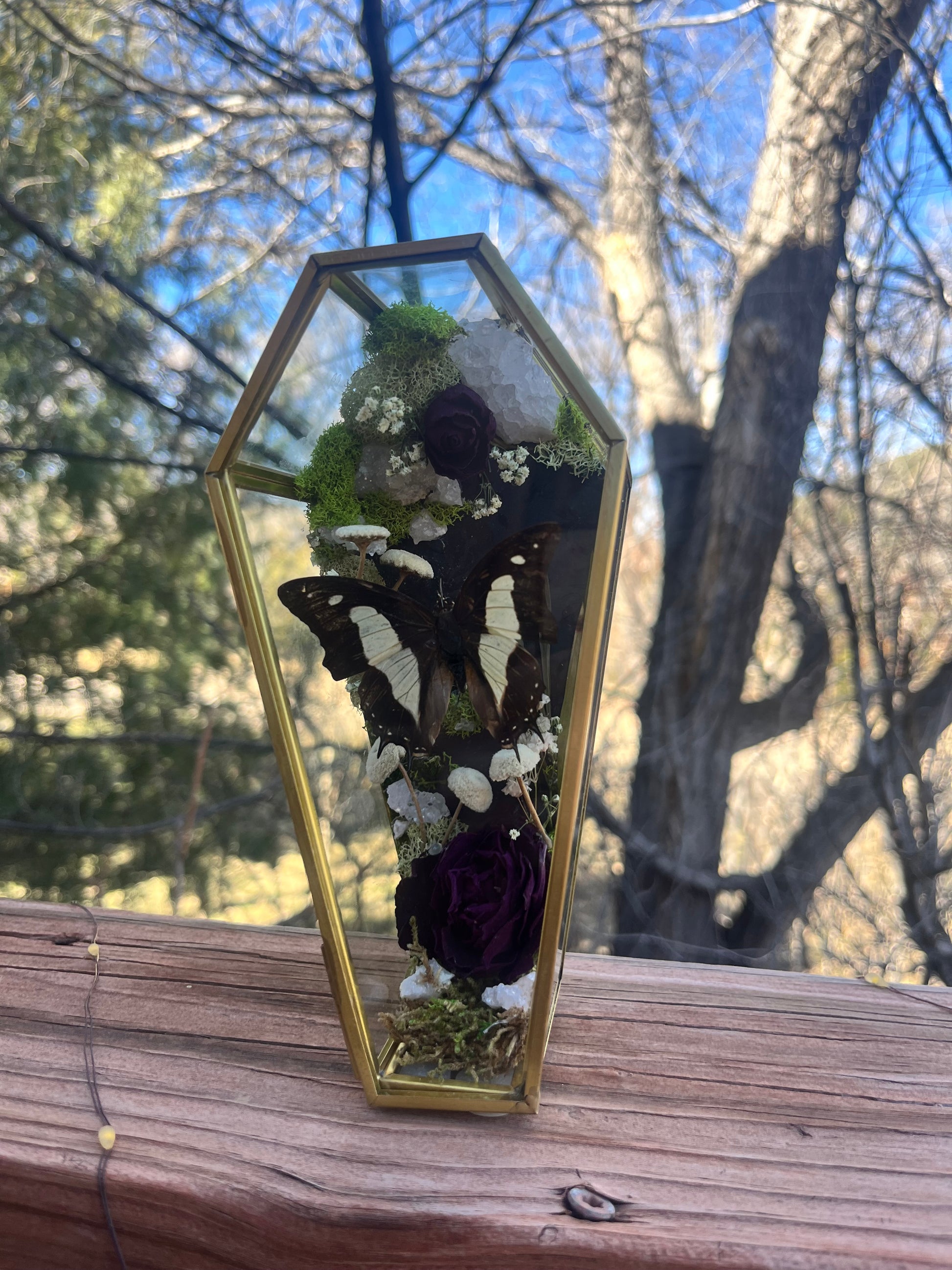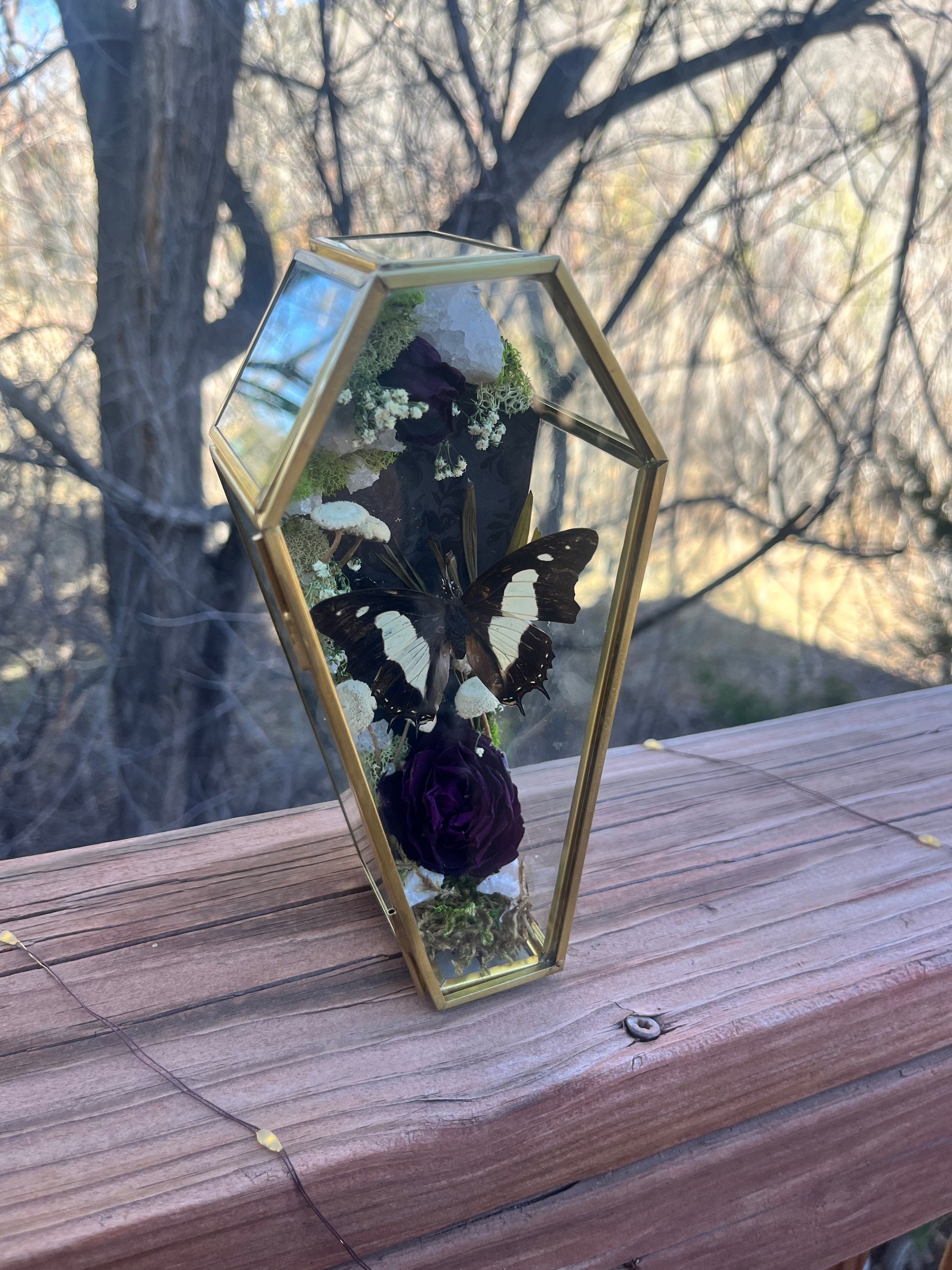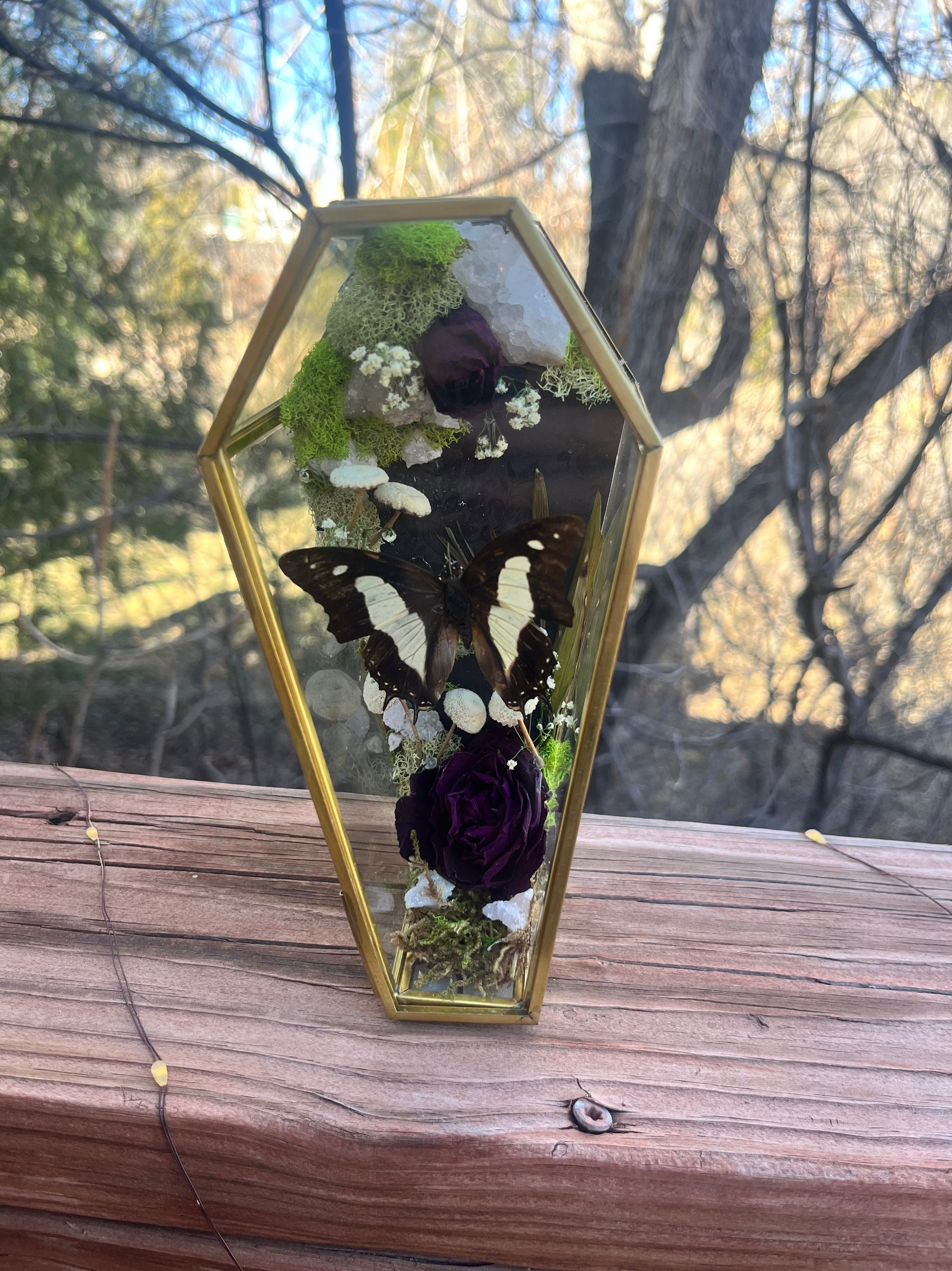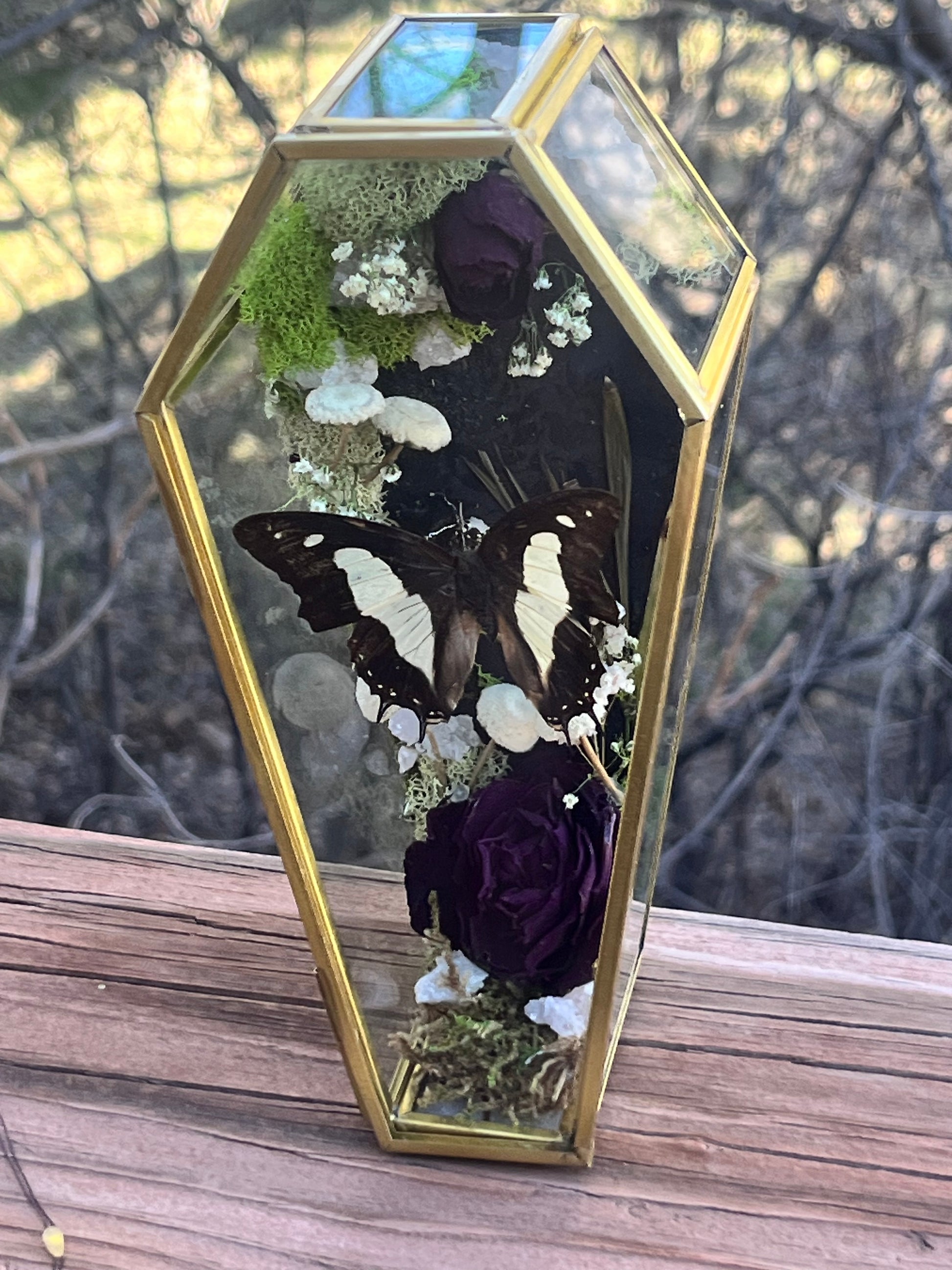 Polyura athamas accompanied by geodes, roses, moss, baby’s breath and mushrooms. (3”x7”)