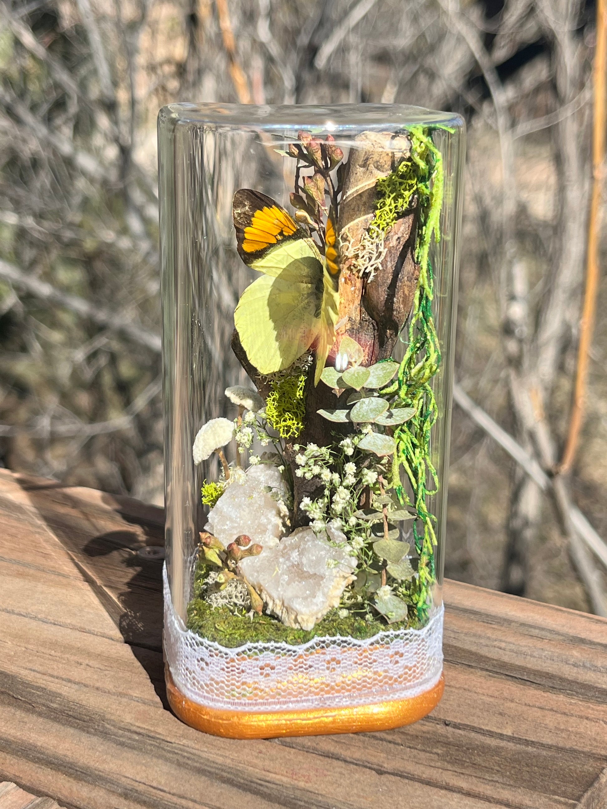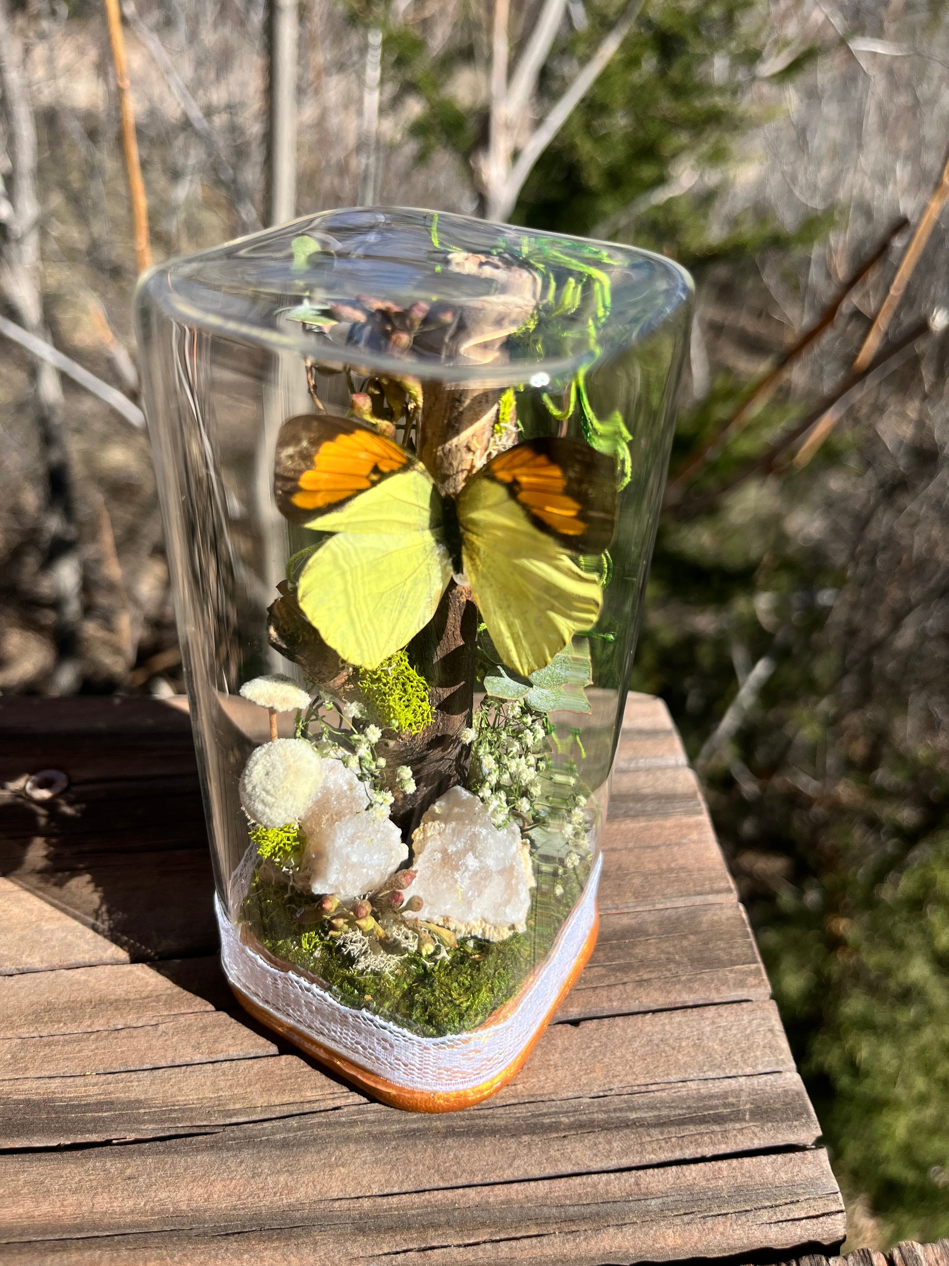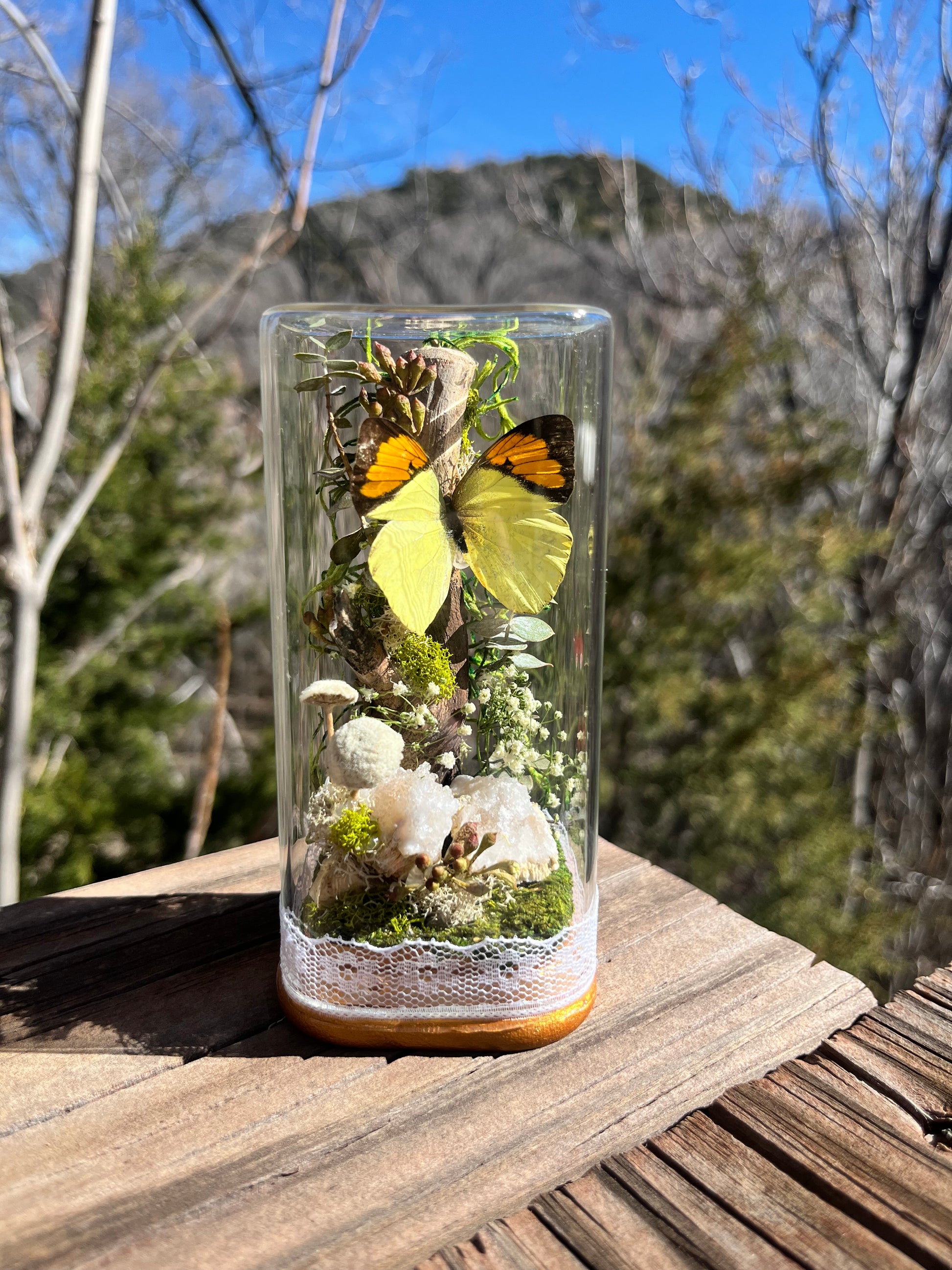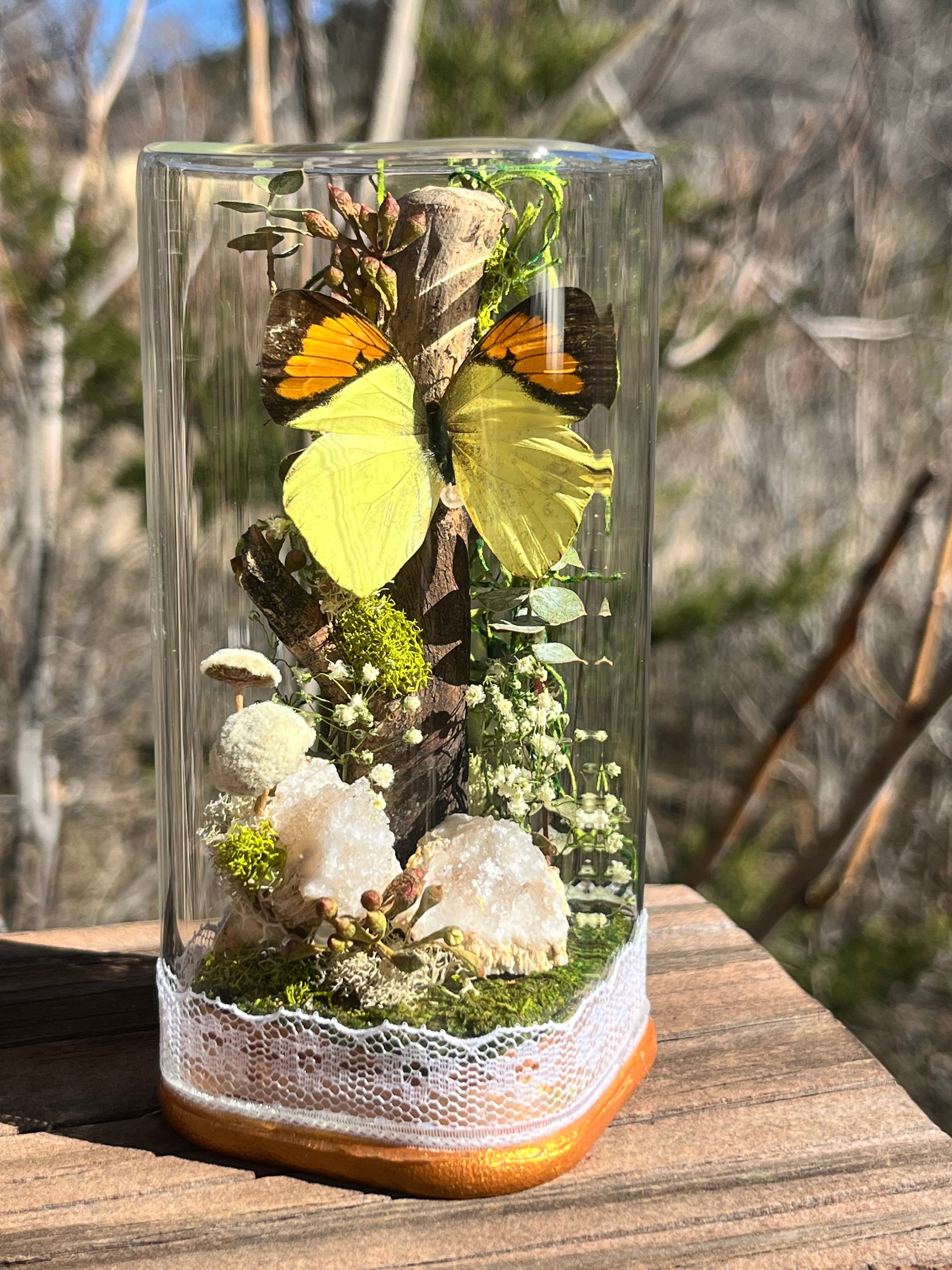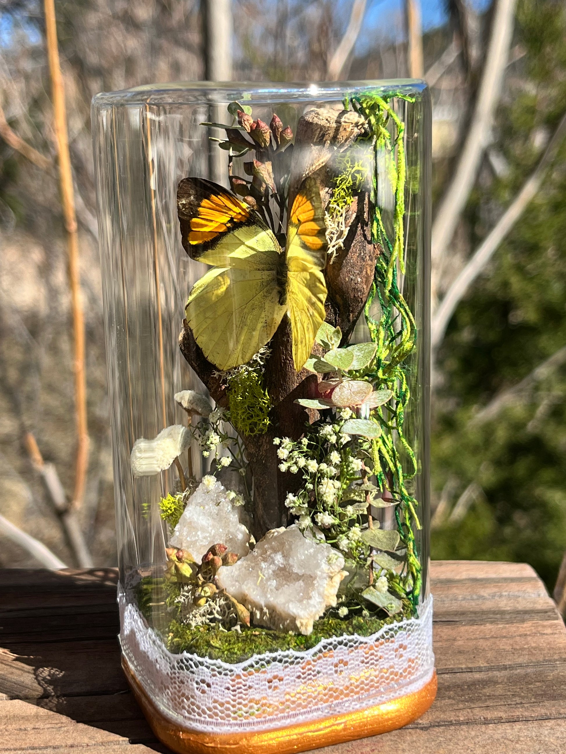 Ixias pyrene Butterfly accompanied by geodes and baby’s breath in a jar (2”x5”)