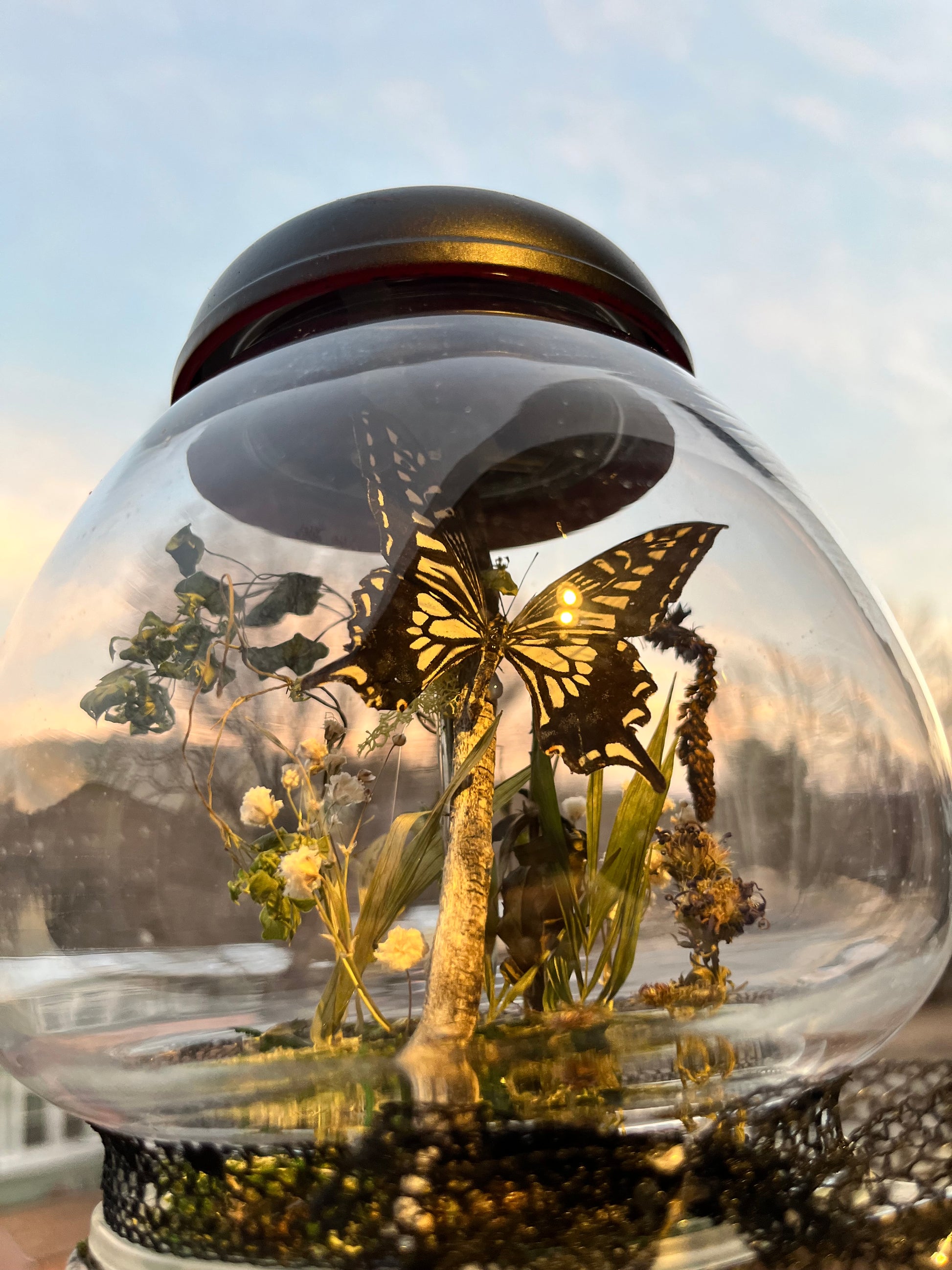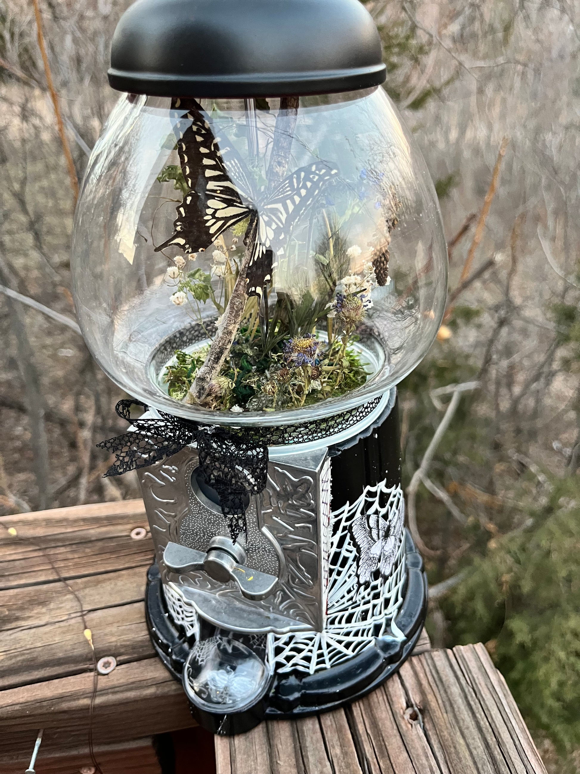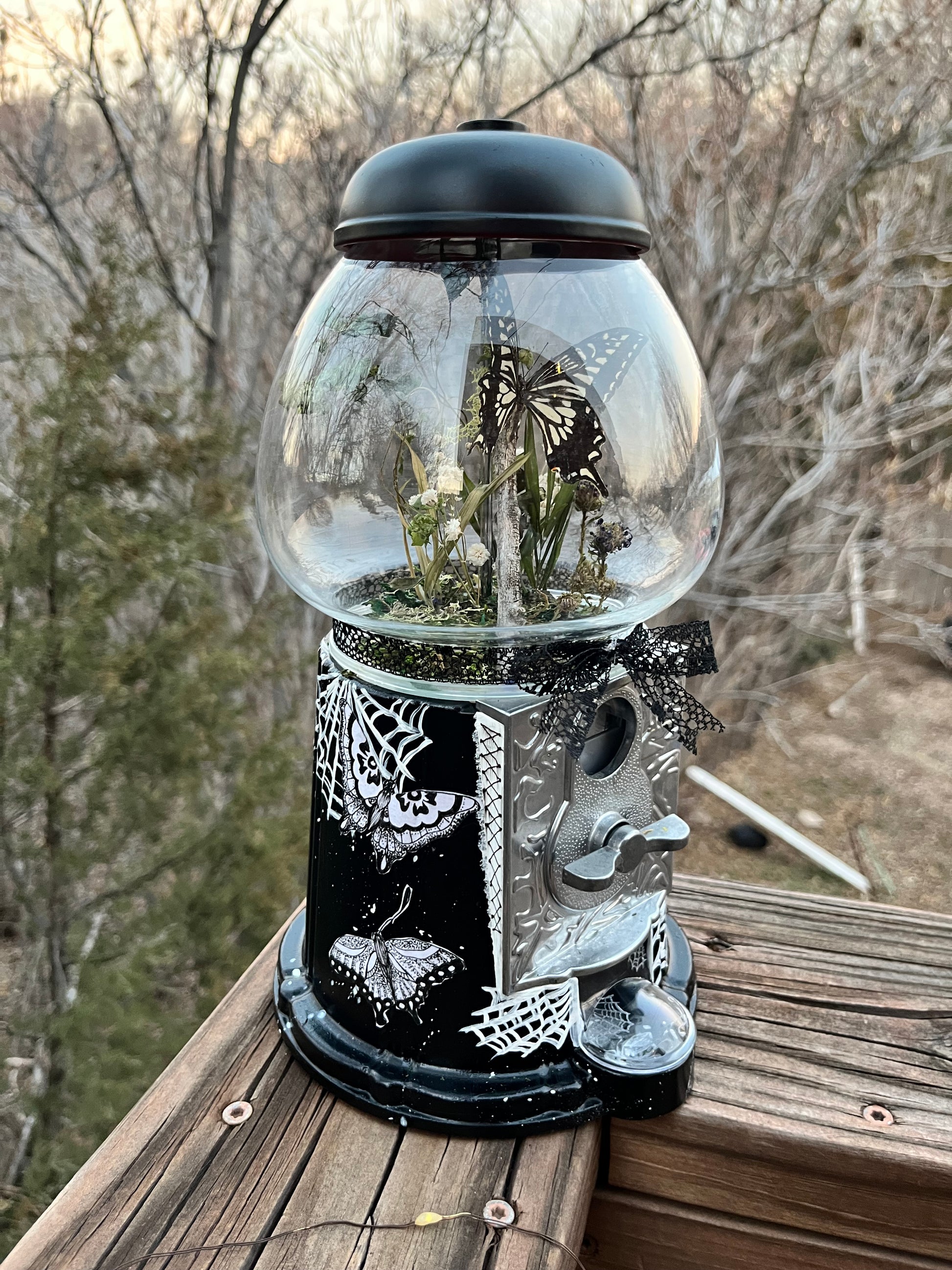 Preserved Papilio xuthus in a vintage gumball machine. (6” x 14”) hand painted and engraved