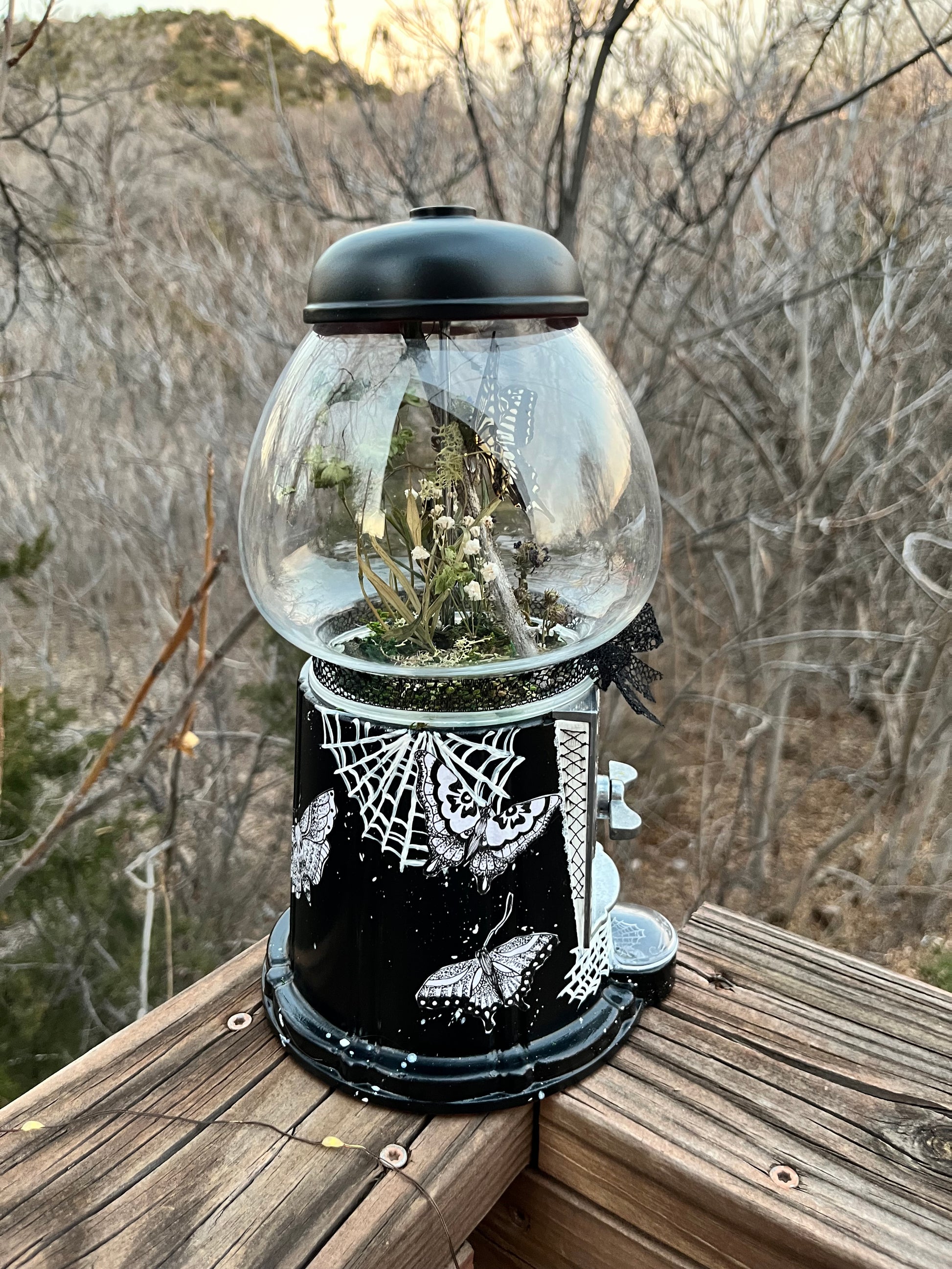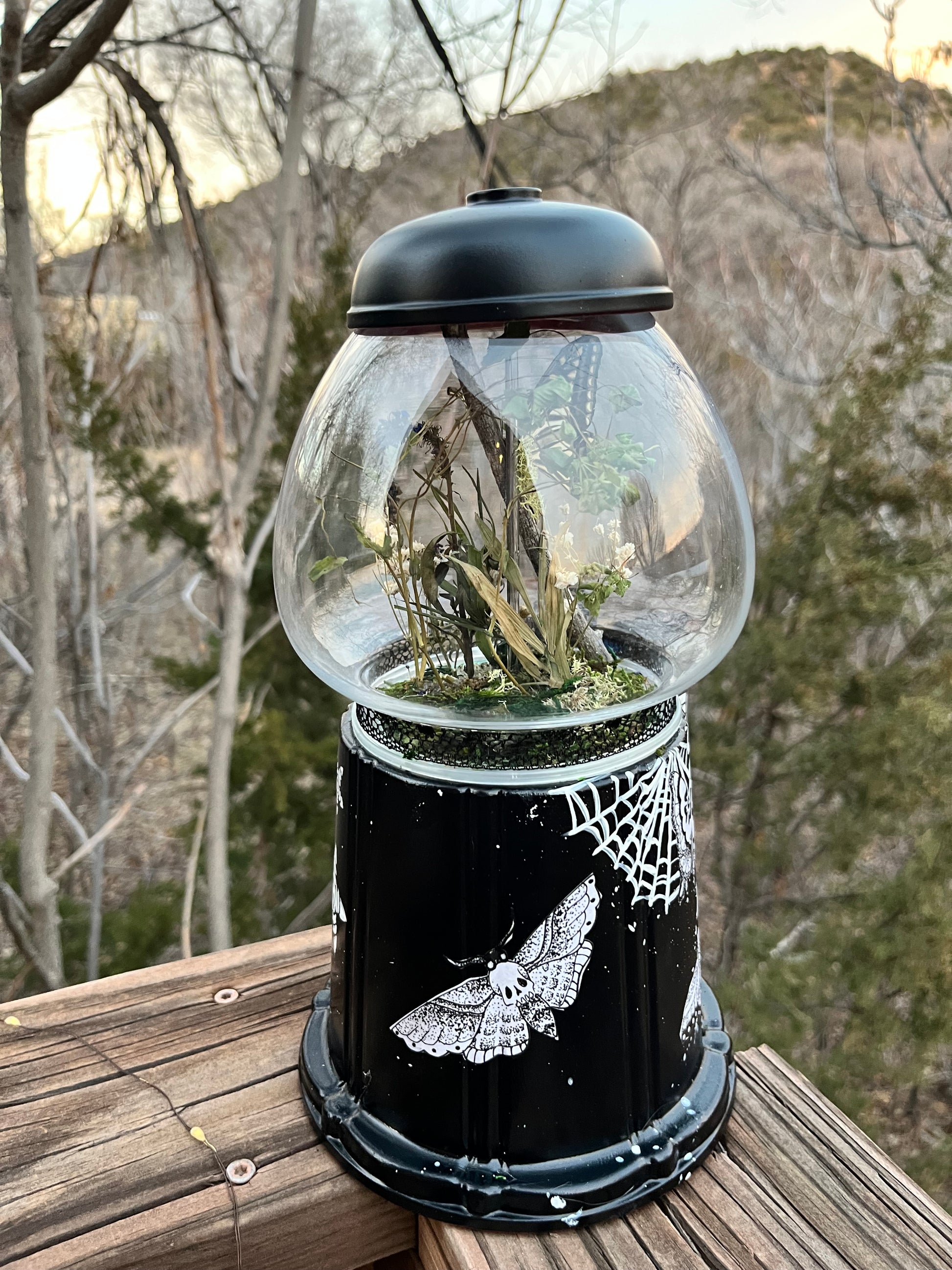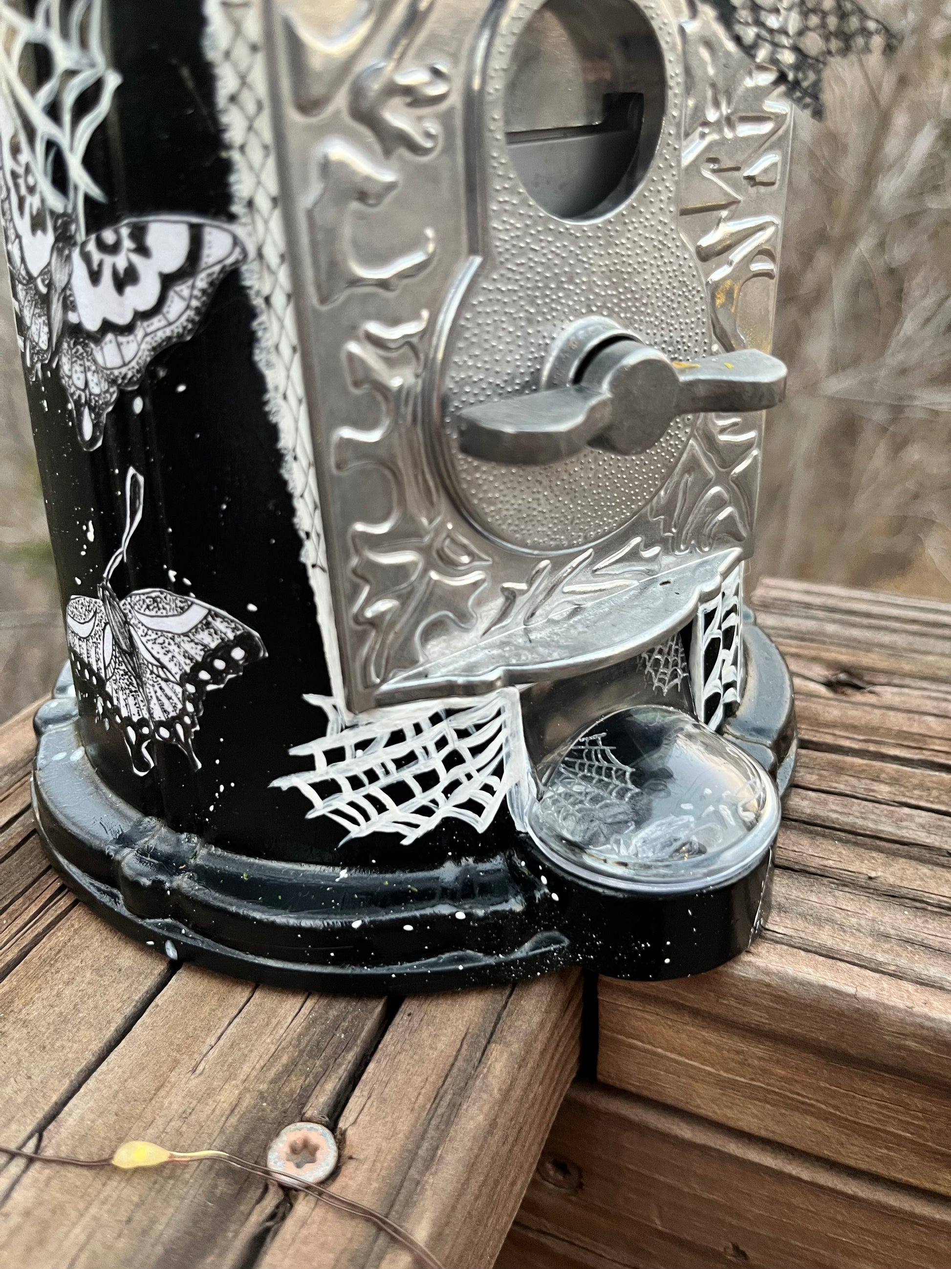 Preserved Papilio xuthus in a vintage gumball machine. (6” x 14”) hand painted and engraved