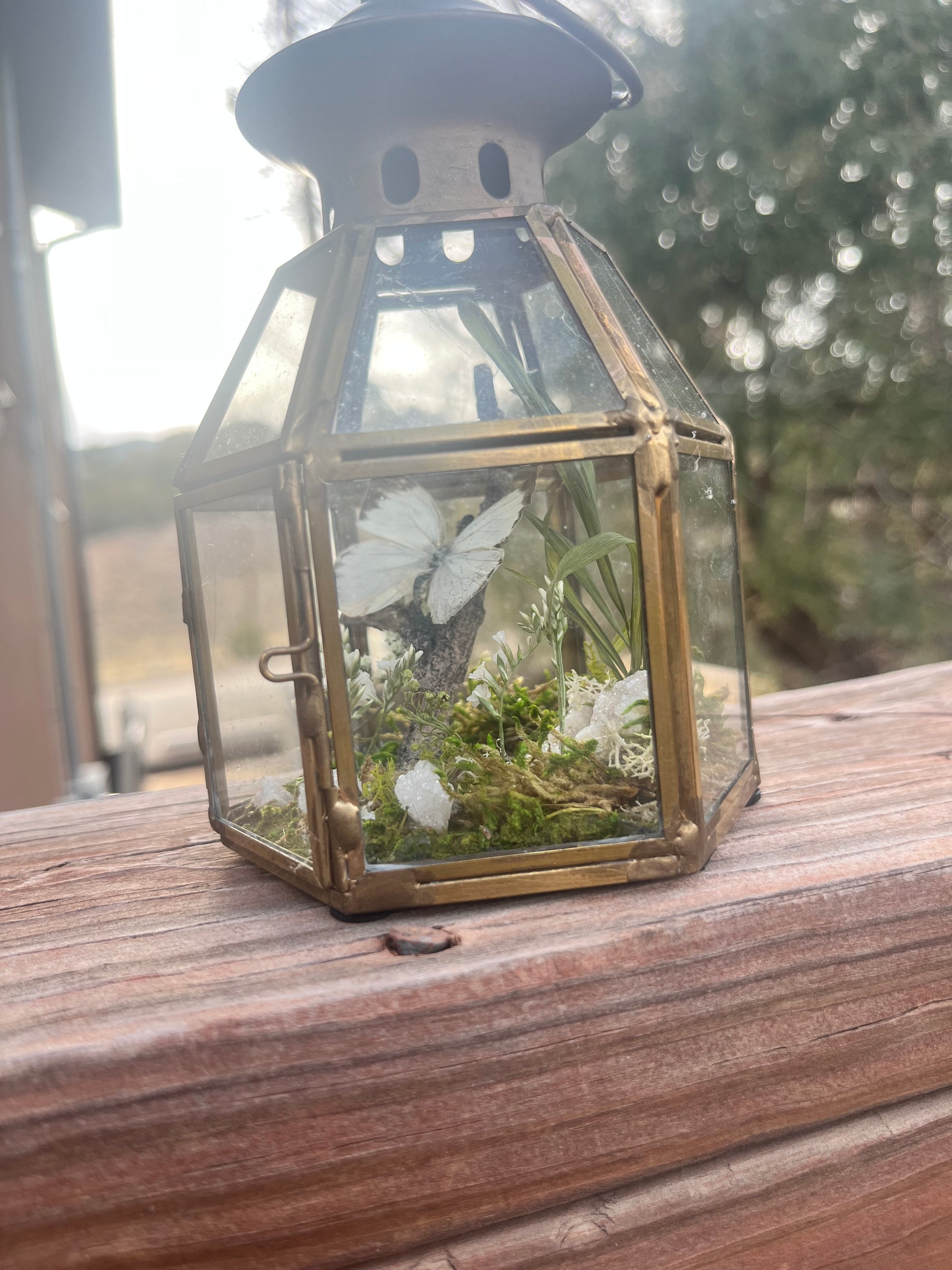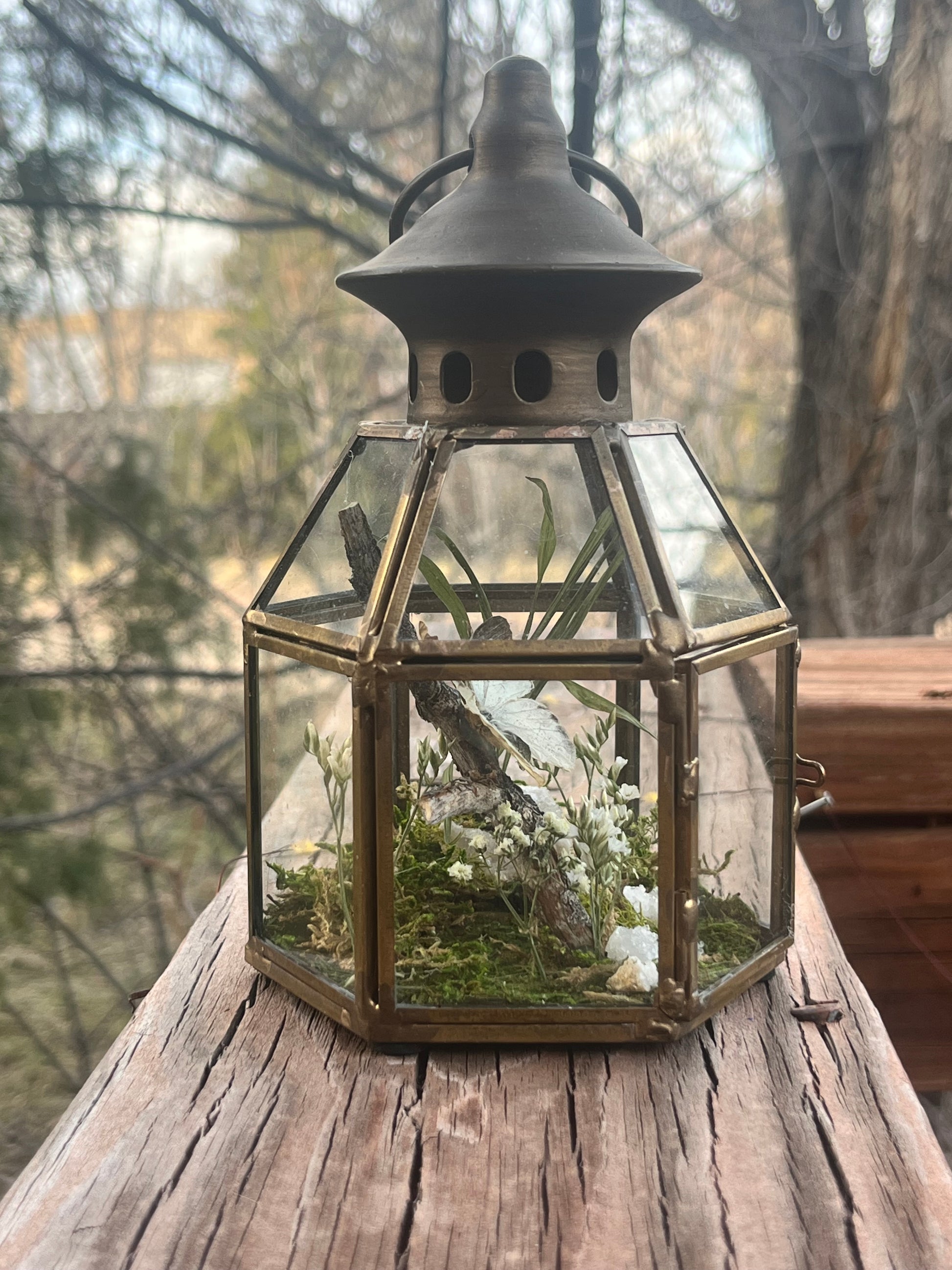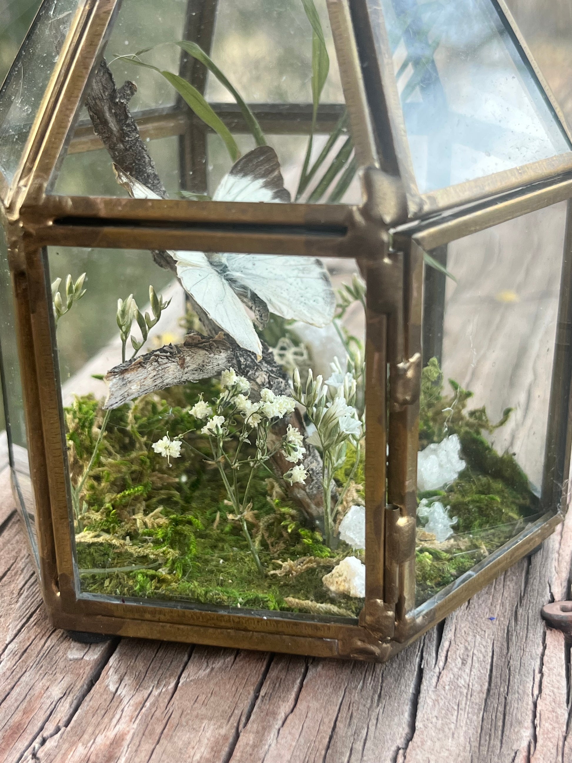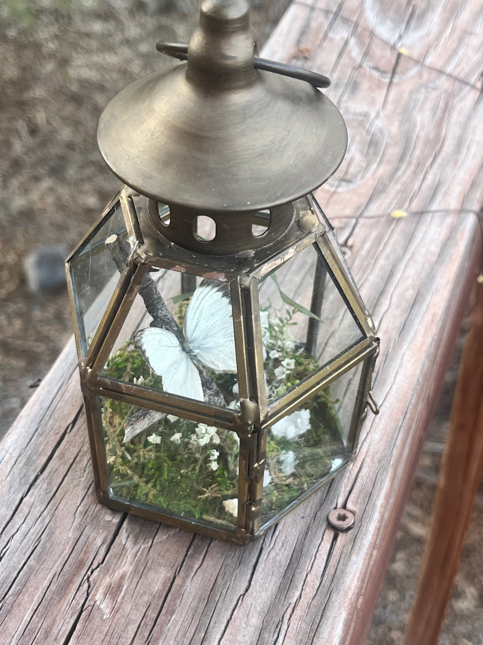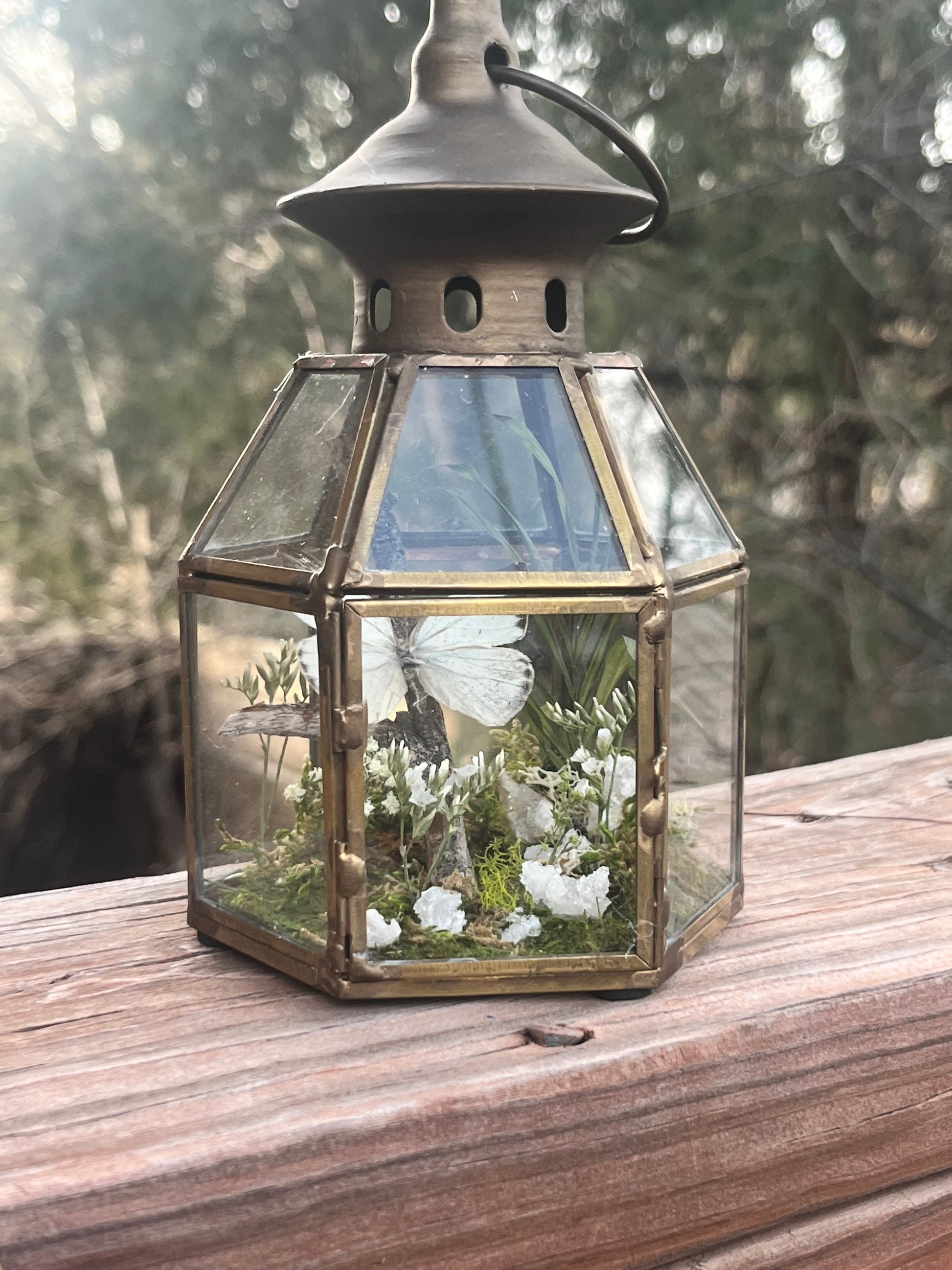 Delias Agoranis accompanied by baby’s breath, geodes, moss in copper lantern (4”x5”)